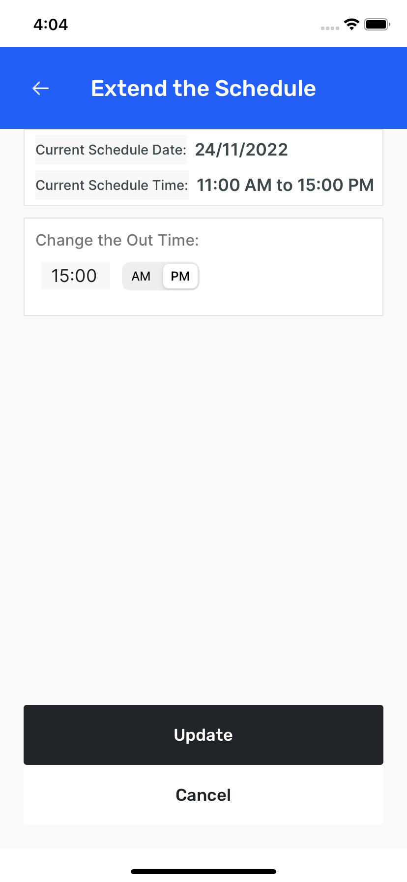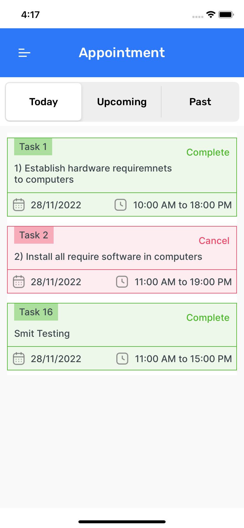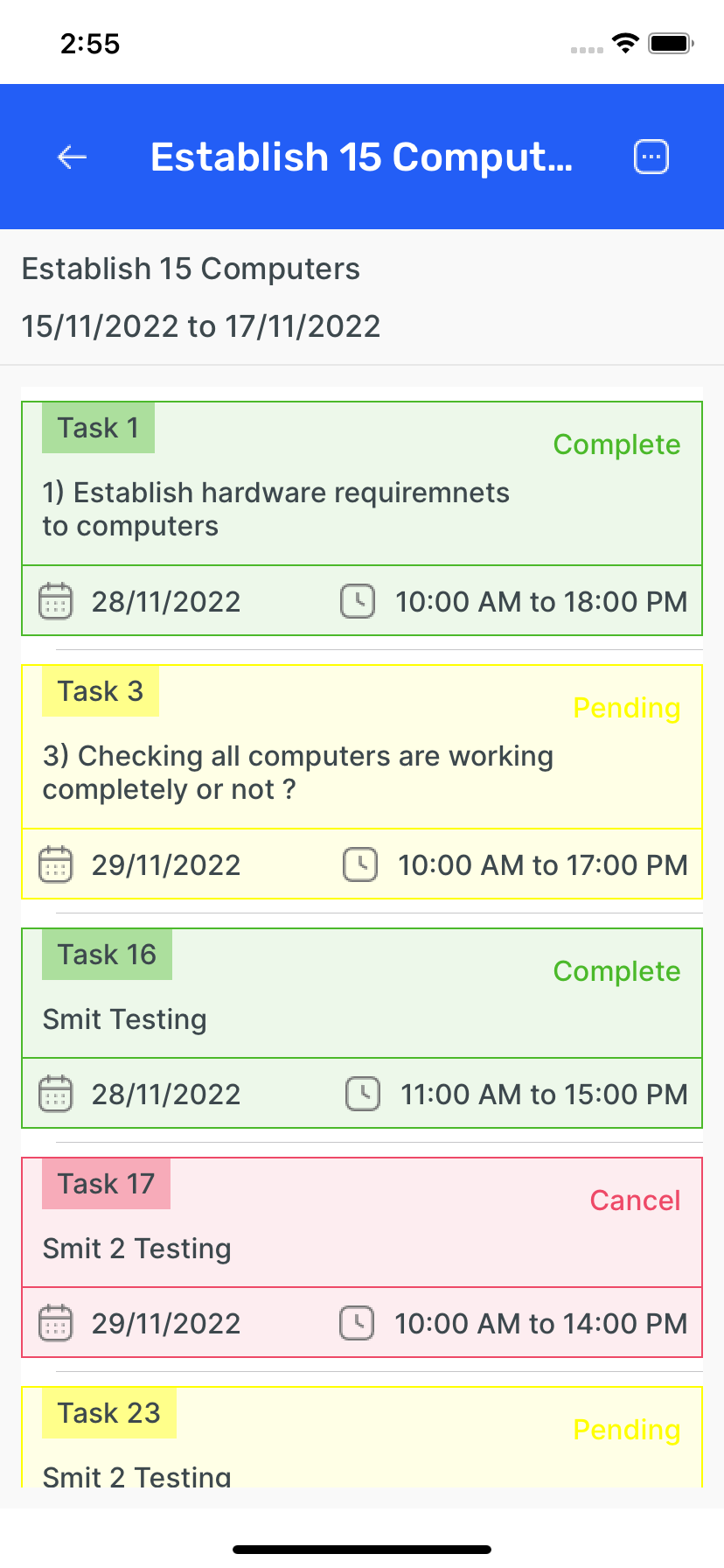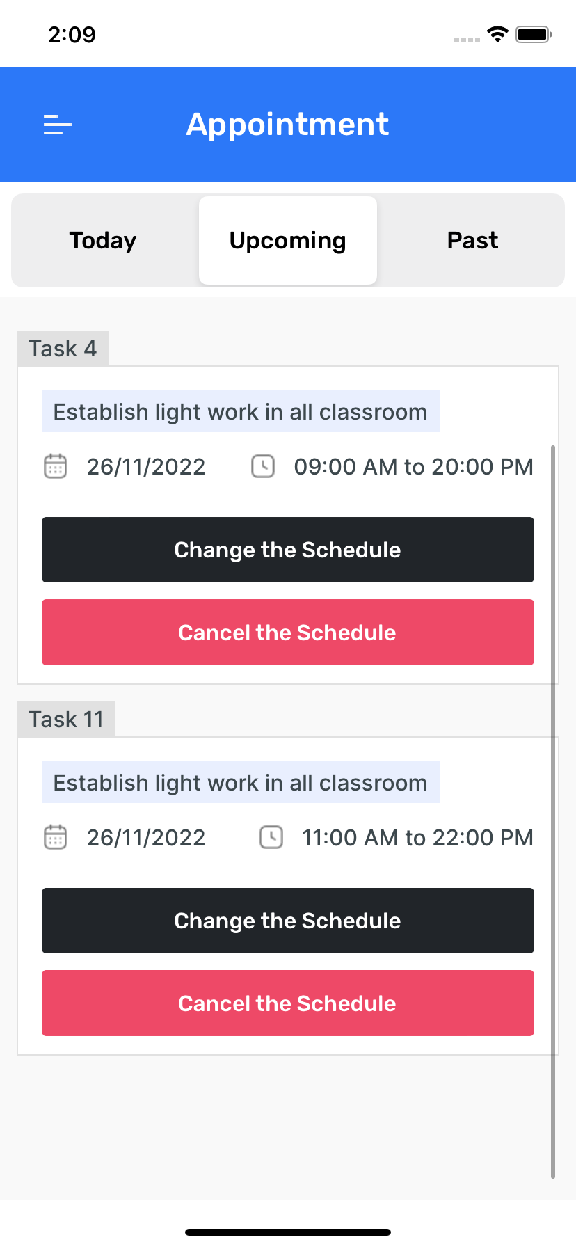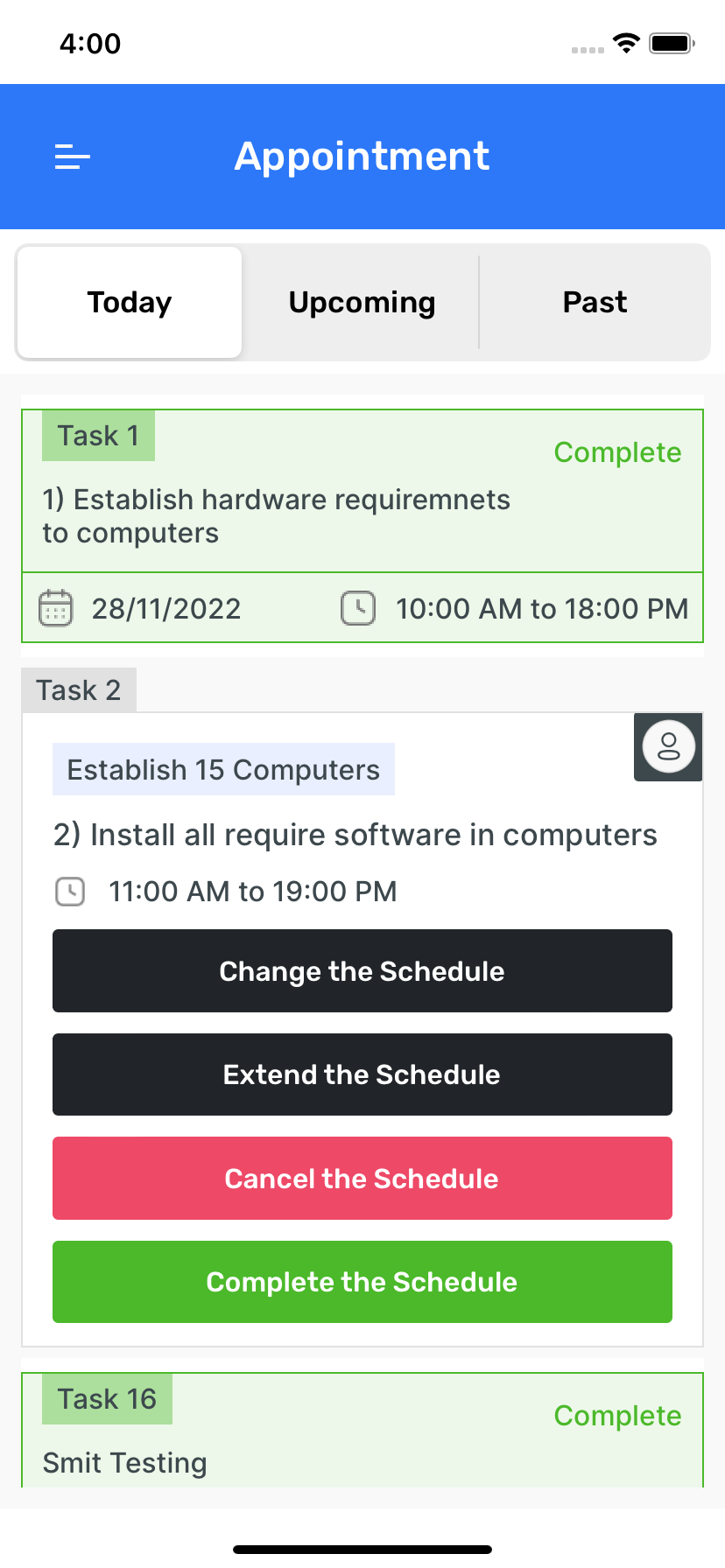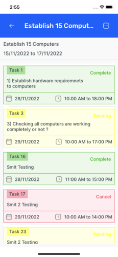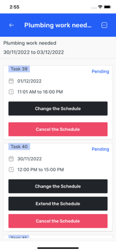 - Task Management : View tasks based on dates and manage them: Cancel tasks, Extend task durations, Reschedule tasks as needed