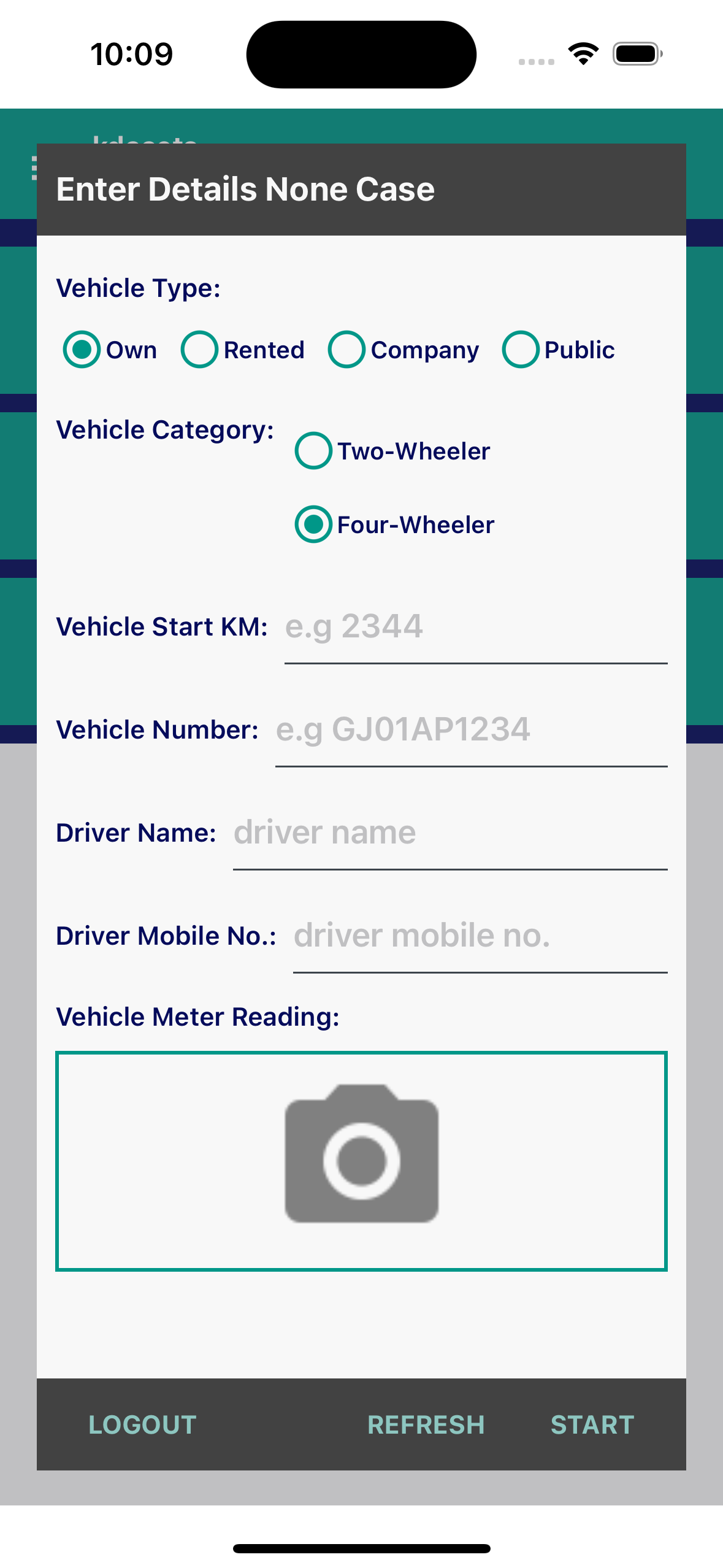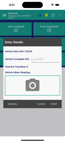 - Vehicle Details: Employees provide vehicle details (start and stop kilometers, vehicle type, driver name, vehicle number, start and stop kilometer photos) for company, rented, or own vehicles.